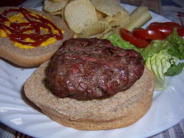 April 8, 2009 – 6:41 pmI’ve been craving hamburgers for a while now. These are an easy American classic and they really hit the spot! I just served them with some Ruffles Natural Sea Salt Potato Chips (reduced fat and taste like actual potatoes 🙂 ) and a tossed green salad. The buns I got were a bit big. Next time I’ll get smaller ones.