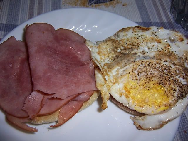 April 12, 2009 – 4:24 pmFor breakfast I fried some eggs and deli ham and put them on toasted sourdough english muffins. A quick and filling breakfast. We also hard boiled some eggs, but no pictures of those.