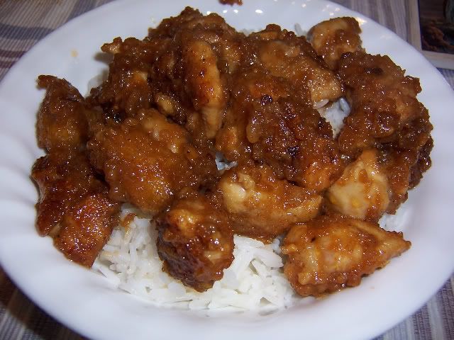 May 7, 2009 – 5:57 pmThe recipe for Sweet, Sticky, Spicy Chicken from Allrecipes has been making the rounds on a message board that I frequent, and it’s become a staple of quite a few of my friends. I made a few changes, of course. First, I used skinless boneless chicken thighs instead of breasts. I followed the recommendations of my friend Cristan to marinate the chicken in pineapple juice for the day and to lightly coat the pieces in cornstarch before cooking. I also cooked the sauce separately, as I wanted to add the pineapple juice from the marinade and wanted to make sure that I cooked it thoroughly. Next time I might try a recommendation from another friend, Michelle, and toast up some szechuan peppercorns just before adding the sauce.