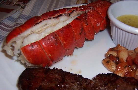 May 10, 2009 – 5:40 pmHappy Mother’s Day! We could not be with our mothers today, but we still wanted to have a nice dinner in honor of them. I grilled up some top round tip steaks with my galbi marinade (pretty good, but the marinade is better on the thin flanken-cut short ribs), grilled up a couple little 4 oz lobster tails since they were on a great sale this week, and for a side dish we had some Italian style beans (like this Italian Vegetable Sauté, but without the zucchini today, and made with a can of diced tomatoes instead of fresh). It was a very nice little dinner, and we’re just sorry that we couldn’t share it with our families in person!