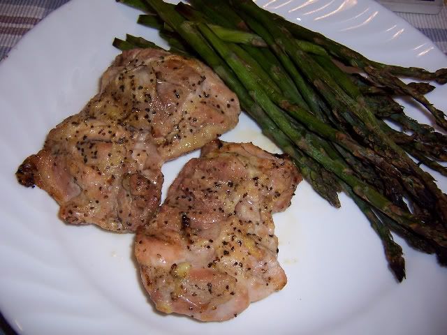 June 7, 2009 – 5:40 pmAnother night grilling dinner. This is a very tasty and simple non-recipe. Sprinkle skinless boneless chicken thighs lightly with lemon pepper seasoning and grill over medium heat for about 12 minutes total, or until cooked through. I served this with some grilled asparagus that I cooked for the same amount of time in a little grill-top skillet.