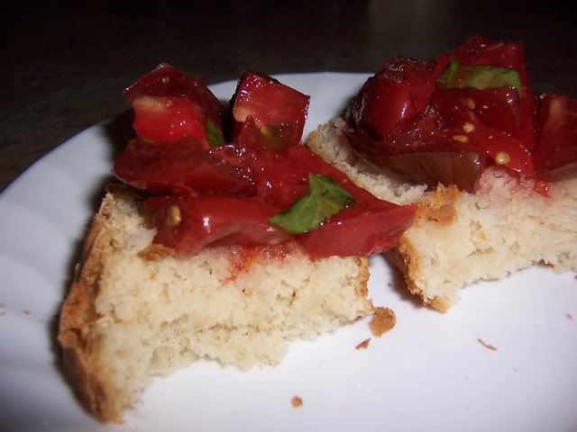 July 3, 2009 – 7:40 pmThis is a quick and refreshing summer appetizer. I made some beer bread this evening and made the tomato bruschetta topping on a whim since I had a couple nice heirloom tomatoes to use.