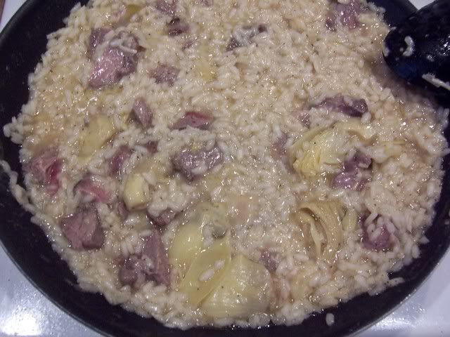July 6, 2009 – 7:16 pmI also made this tonight to use up some more of the lamb and to have for a couple lunches this week. It turned out decently, but not outstanding. I started with my basic risotto recipe and stirred in a quarter cup of freshly grated Parmesan cheese, a small jar of marinated artichoke hearts (drained of the oil) and about 8 oz of cooked lamb, cut into bite sized pieces at the end of the cooking time and let it simmer for another 5 minutes to heat the artichoke and lamb through.