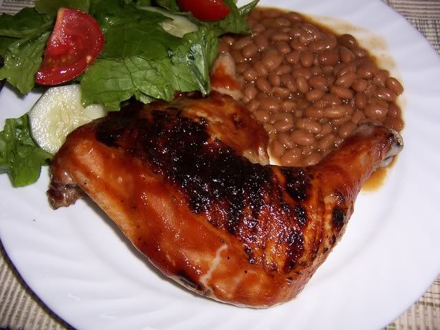 July 15, 2009 – 7:26 pmThis was a very tasty dinner, despite running out of propane just a few minutes into cooking. I finished up the chicken under a low heat broiler and it turned out just fine. I think I’ll probably do it that way from now on, anyway, since this way I don’t have to clean up a lot of chicken grease from the grill. For sides I heated up some baked beans and made a green salad with romaine, tomatoes, and cucumbers. The brine is the key to delicious juicy chicken.
