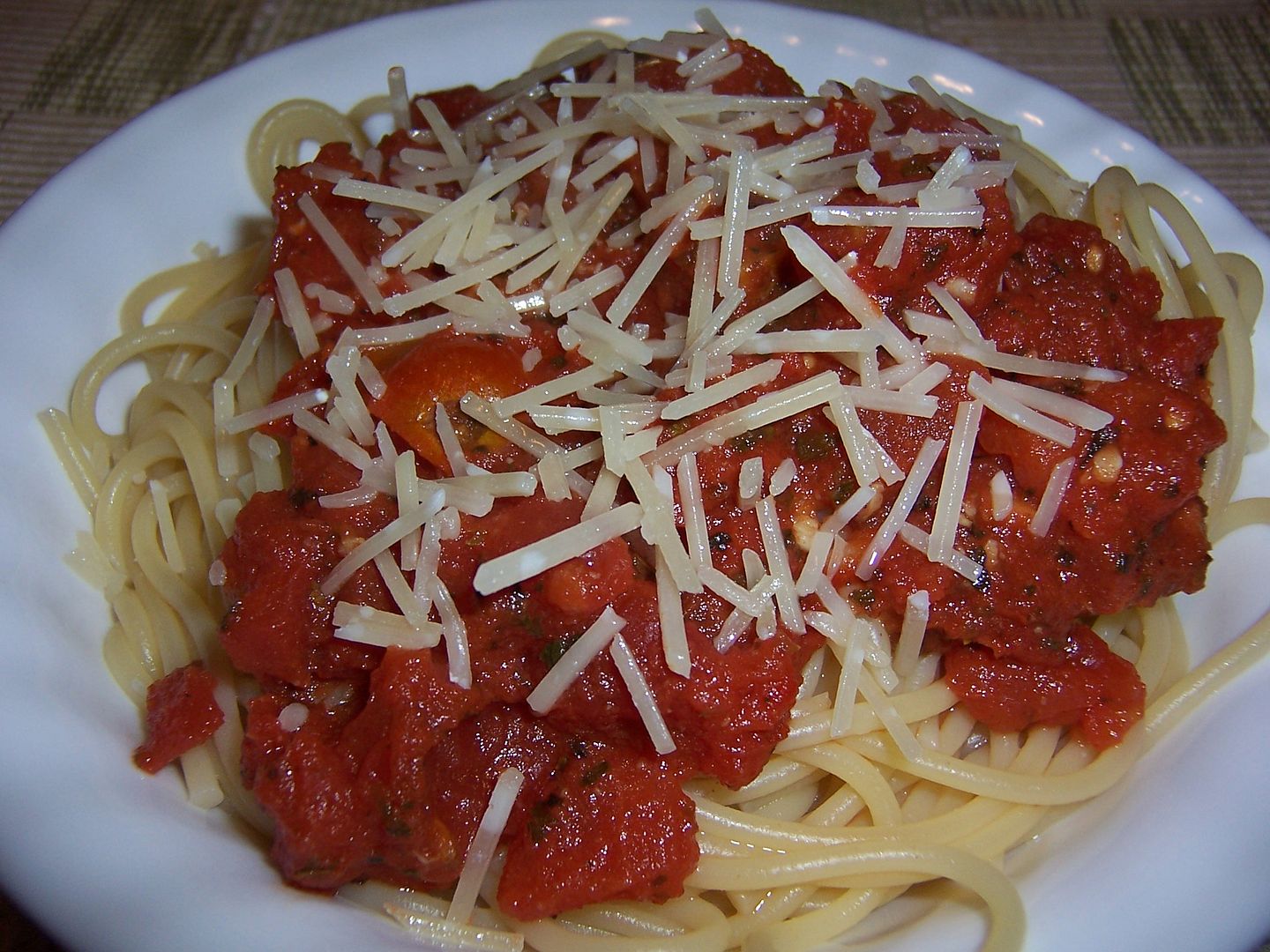 I just sautéed a couple cloves of garlic in olive oil, then added a can of diced tomatoes and some dried oregano, dried basil, black pepper, onion powder, and a pinch of sugar. I let that simmer while the pasta cooked, and voila, dinner.