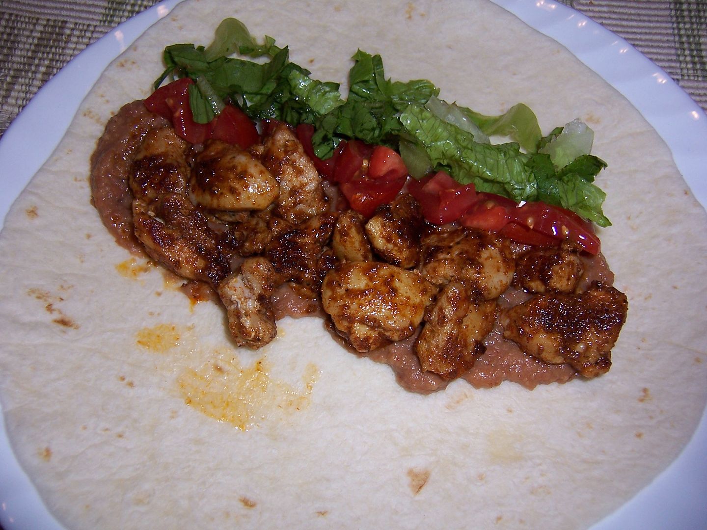 I cooked a pound of skinless boneless chicken thighs in my usual burrito seasonings and served with beans, lettuce, and tomato.