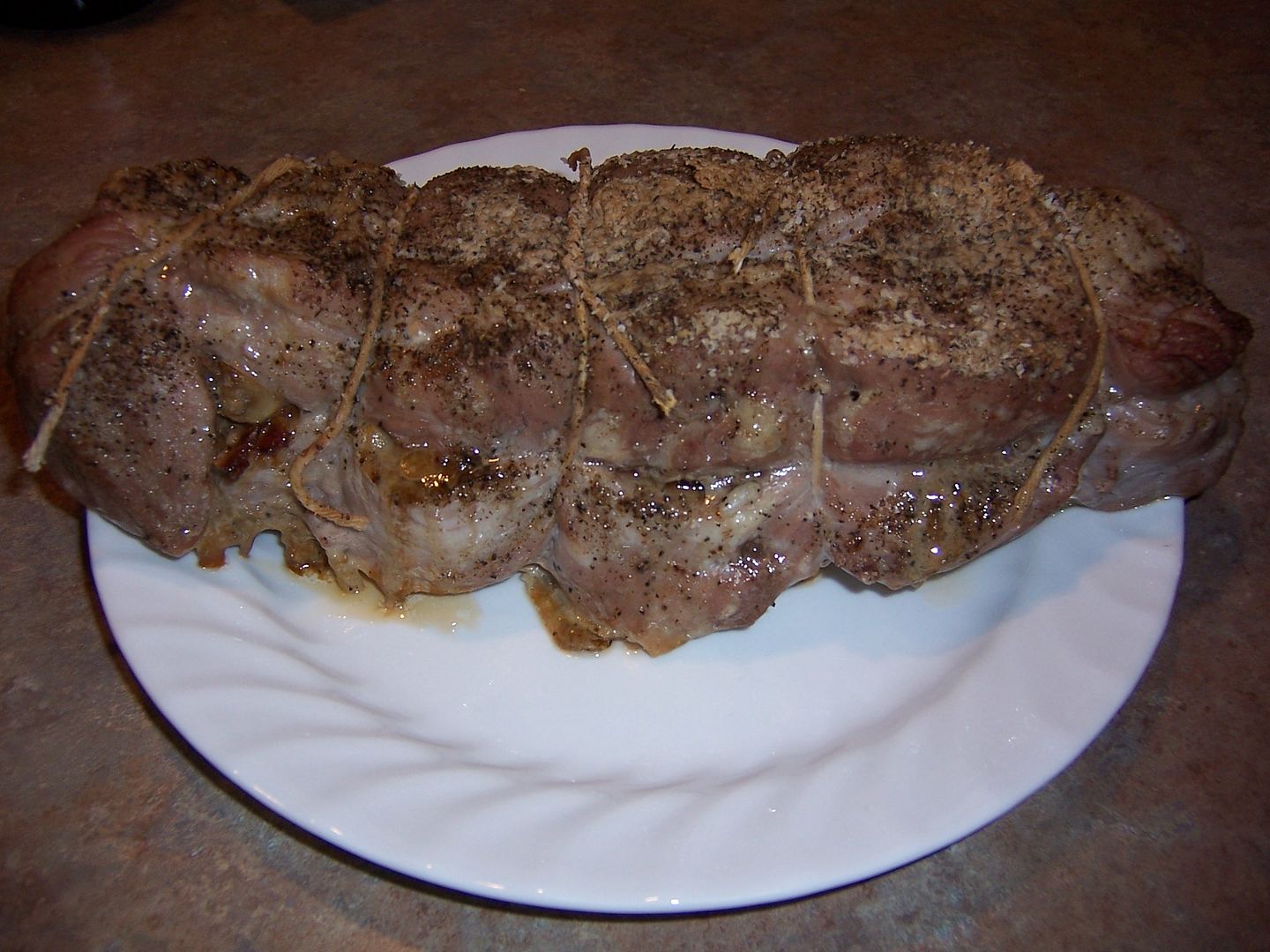 December 22, 2009 – 7:14 pmThis is a creation of my own, inspired by many recipes online. It turned out quite well for off the cuff. The bacon was a bit overwhelming, and I’ll definitely use regular hickory or alderwood smoked next time rather than honey maple, but we’re definitely using this as a launching point! The salt and pepper crust was great, and the pork was tender and juicy.