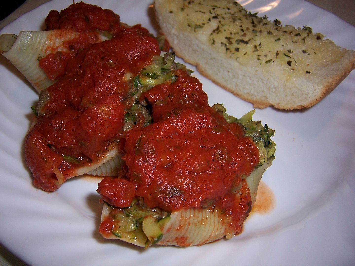 Stuff 18 to 20 of the best shells (several of them will be broken, so just discard those or reserve them to eat as leftovers later) with the meat mixture and place in the baking dish. Pour sauce over the shells and cover the pan tightly with foil. Bake for 30 minutes. Serve hot with garlic bread.