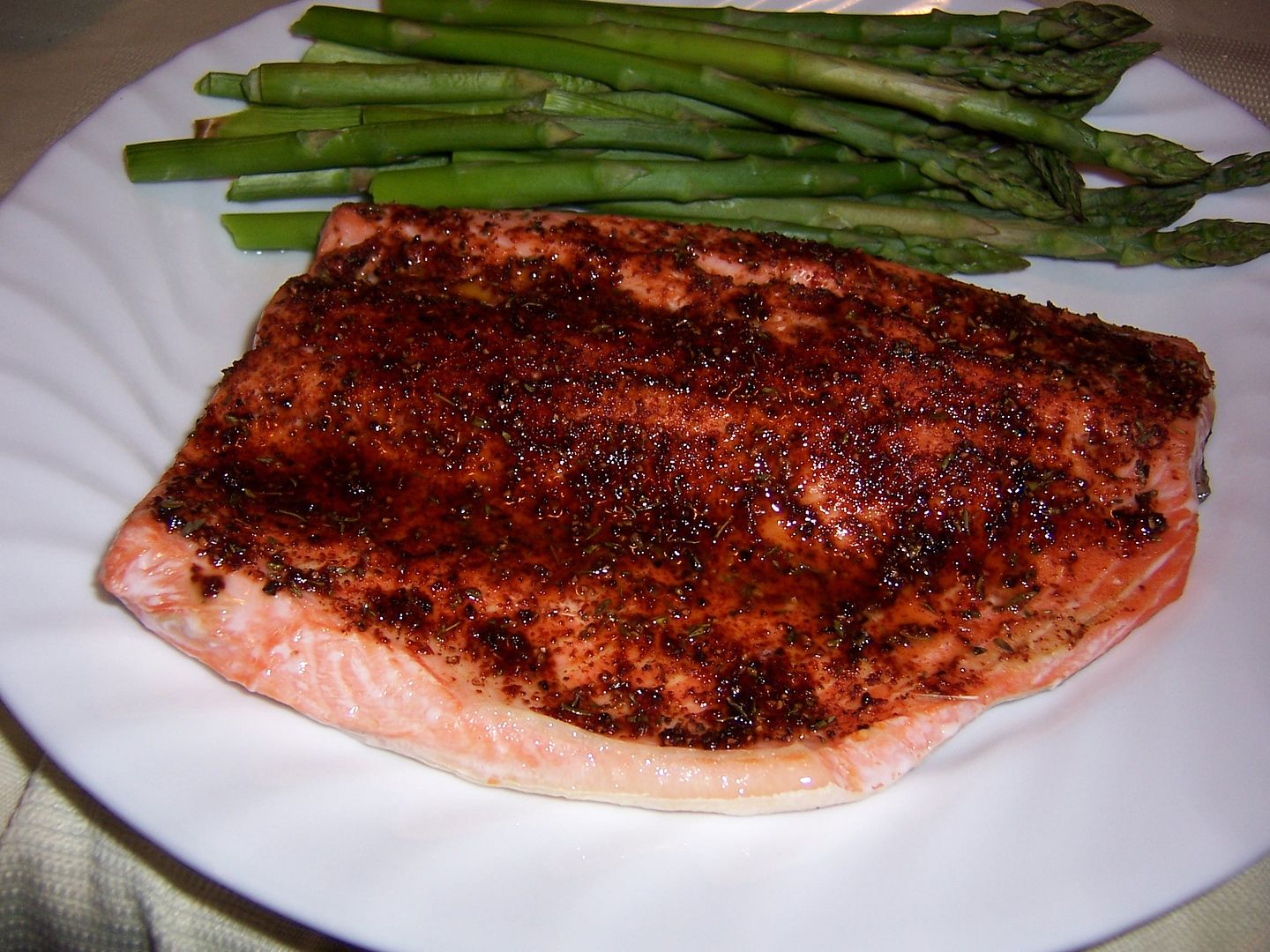 February 2, 2010 – 6:20 pmThis was a really easy and tasty meal – 15 minutes from grocery bag to table! The store had a big sale on coho salmon today and they were doing samples with Tom Douglas’ Rub With Love Salmon Rub. This is a combination of brown sugar, smoked paprika, kosher salt, black pepper, and thyme. They sold me on a container of the rub and a couple nice little salmon fillets with the wonderful smell 🙂 This simple recipe is on the lid of the rub, which states that it’s used at Tom Douglas’ Etta’s Seafood Restaurant in downtown Seattle, thus the name of the recipe. They sauteed theirs with a mix of olive oil and butter, while I did mine under the broiler. I served this with some asparagus that I broiled at the same time.
