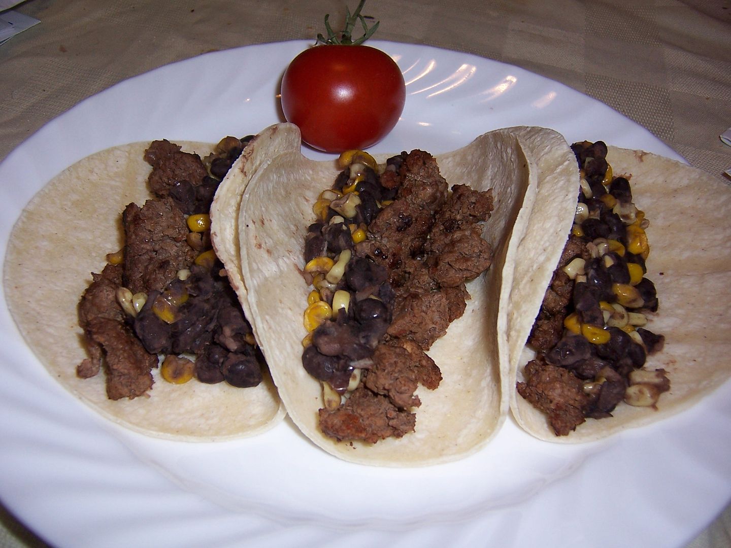 In a large skillet, brown the buffalo with the cayenne and chile powder. As it cooks, heat the oil in a saucepan. Add the garlic and cook for 30 seconds or until just turning golden and fragrant. Add the beans and corn and the spices and stir to combine. Heat through and simmer until the rest of the meal is done. When the meat is browned, turn off the heat on the beans and the meat and heat the tortillas for 40 seconds in the microwave. Assemble tacos and serve warm.