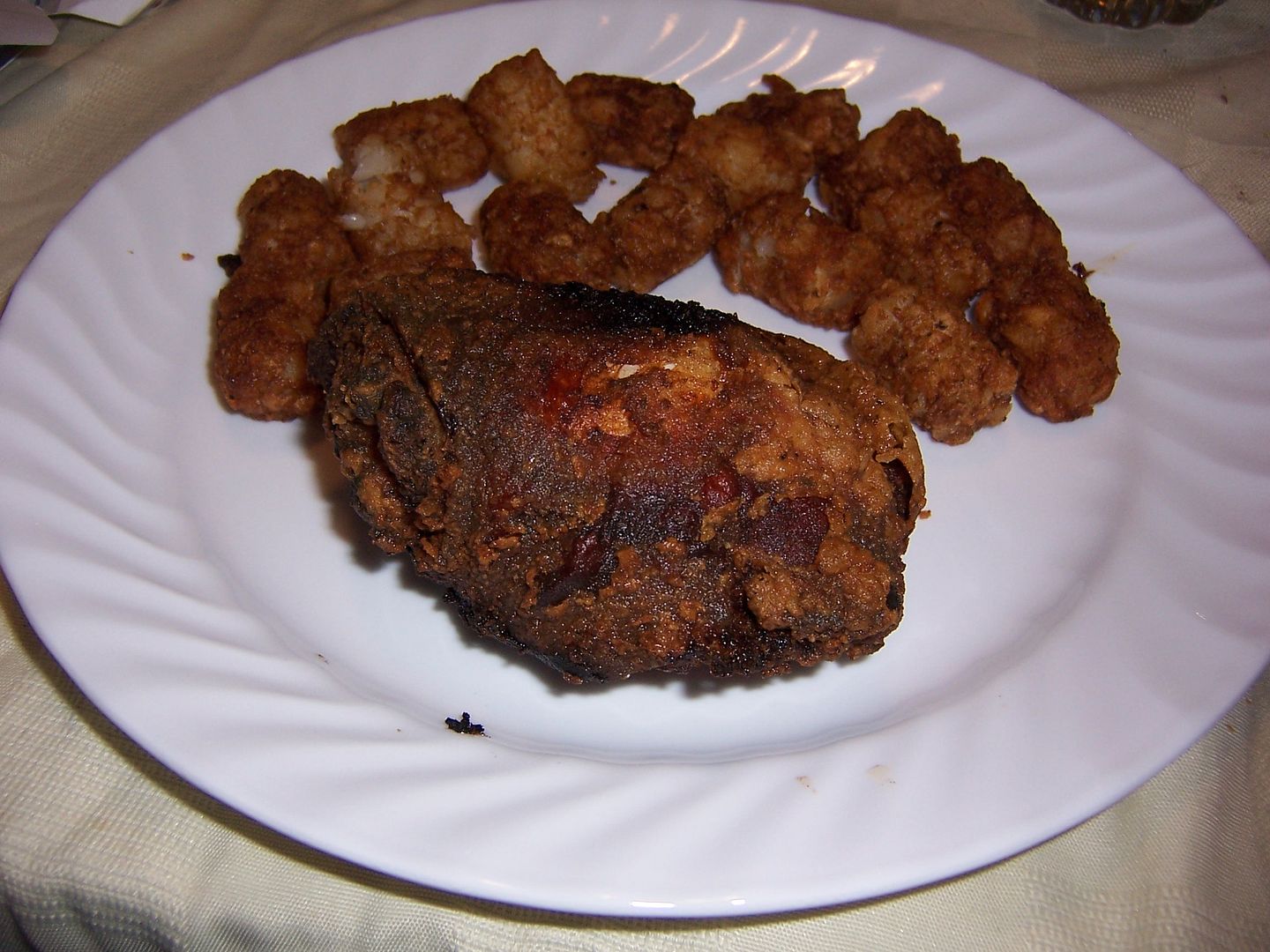March 27, 2010 – 6:17 pmThis is a rich chicken dish – one piece is very satisfying. This was my first attempt at frying, and it went okay, but it’s still a learning process for now. The recommended temperature of 350 degrees for the oil was too hot, though. The chicken got a little burned, but the tater tots turned out perfectly.