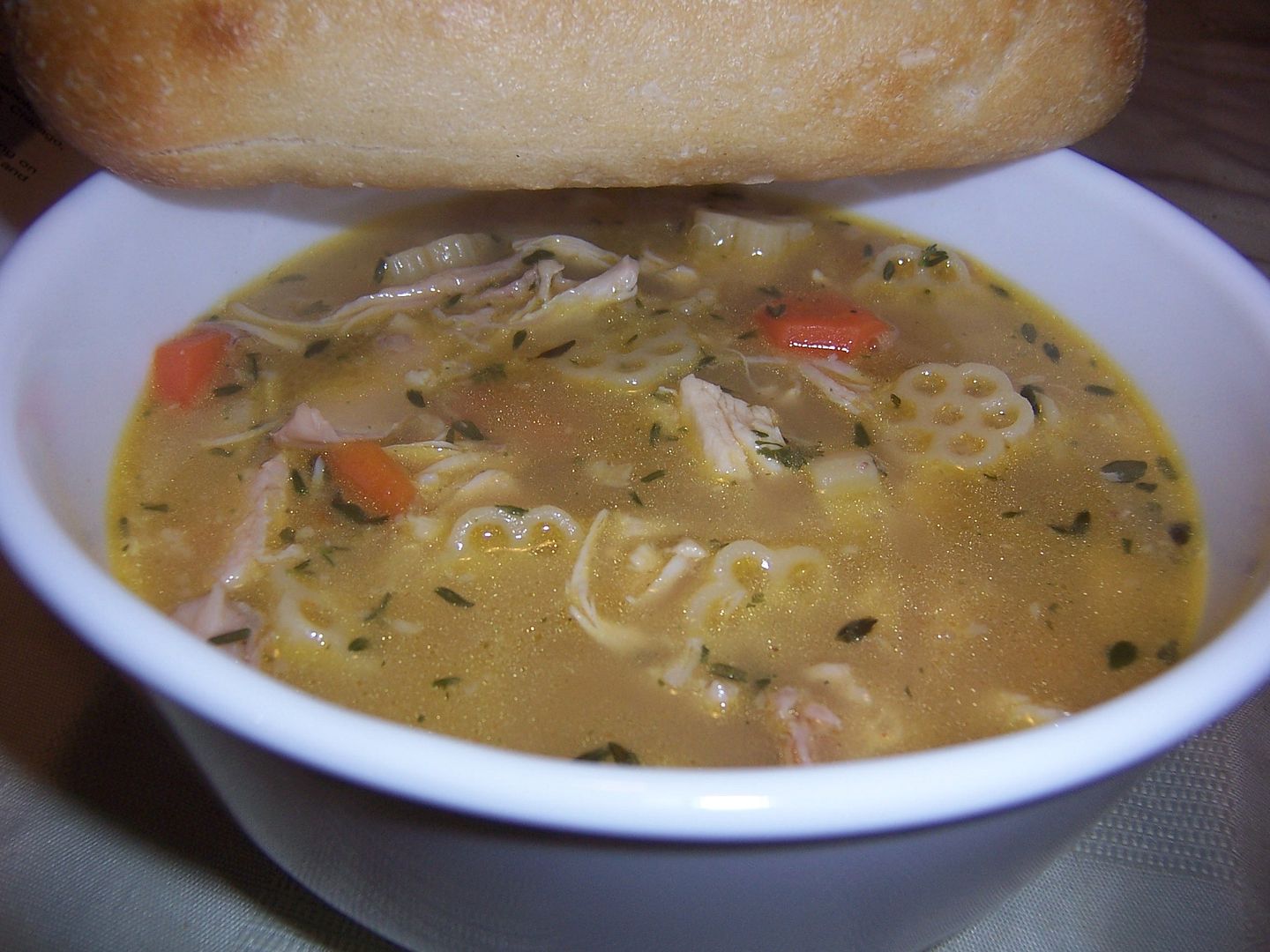 March 31, 2010 – 6:47 pmChicken noodle soup tonight – I had a dentist appointment after work, so an easy to chew dinner was in order. Today I browned the butter a bit for more flavor, used leftover rotisserie chicken, used fiori instead of egg noodles, and used some fresh thyme since I had it on hand.