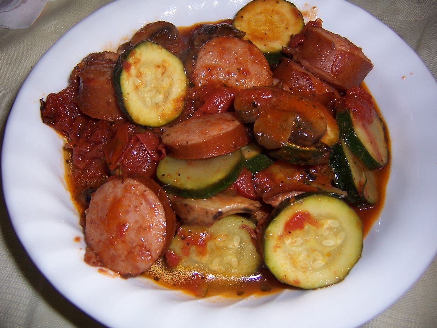 April 4, 2010 – 6:15 pmThis is a variation on my chicken bruschetta, just using a pound of smoked sausage instead of chicken. I do prefer the chicken version, but this is a nice change of pace. I made this for lunch today, with leftovers to take to work for lunches.
