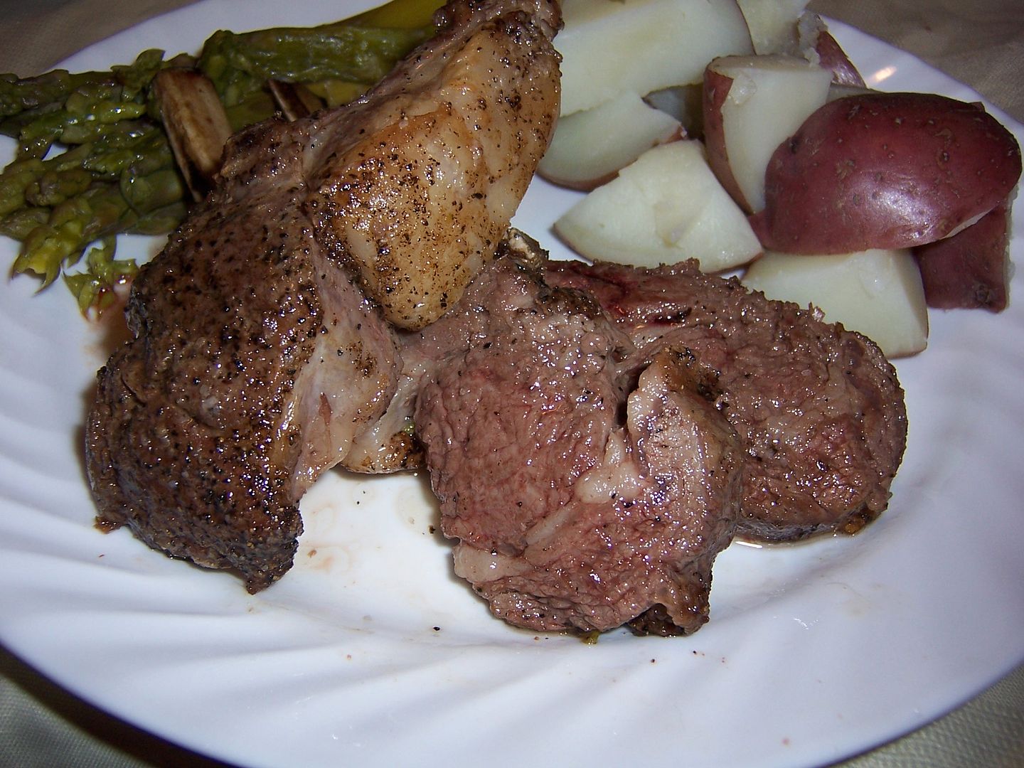 Tender lamb really requires just the simplest of preparations to allow it to shine, and this definitely qualifies. I steamed some asparagus and red potatoes to go alongside. This is very easy to double to serve more – just sear each rack then transfer them both to a roasting pan instead of just using the skilled. As is, it could also be easily stretched to serve four if another side were offered.