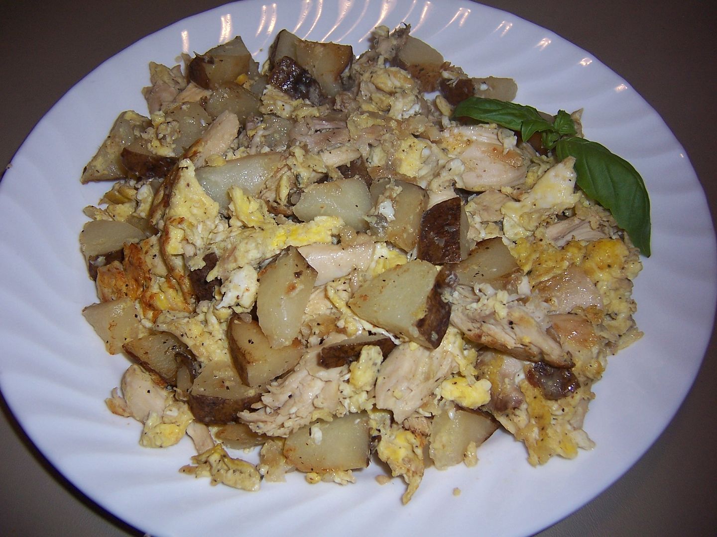 Melt the butter in a large skillet over medium heat. When it starts to foam and lightly brown, add the potatoes and season with salt and pepper. Cook for 2-3 minutes, stirring occasionally, until browned. Add the chicken and stir to combine. Cook for another 2-3 minutes to warm through. Push the potatoes and chicken to the sides and add the eggs. Season with salt and pepper. Gently scramble eggs, stirring into the potatoes and chicken as the curds form. Stir to allow the eggs to cook through on all sides. Serve hot.