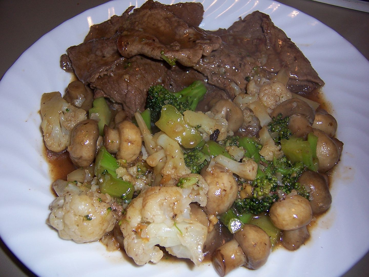 When all the beef is cooked, add the second tbsp of canola oil and tsp of sesame oil and let heat again. Add the mushrooms and cook for 2-3 minutes or until starting to brown. Add the broccoli and cauliflower and stir to combine. Add 1/4 cup of water and cover the pan. Steam the veggies for 4-5 minutes or until just tender. Remove the lid and return the beef to the pan. Add the sauce and toss to combine. Let the sauce come to a boil to thicken. Serve hot.