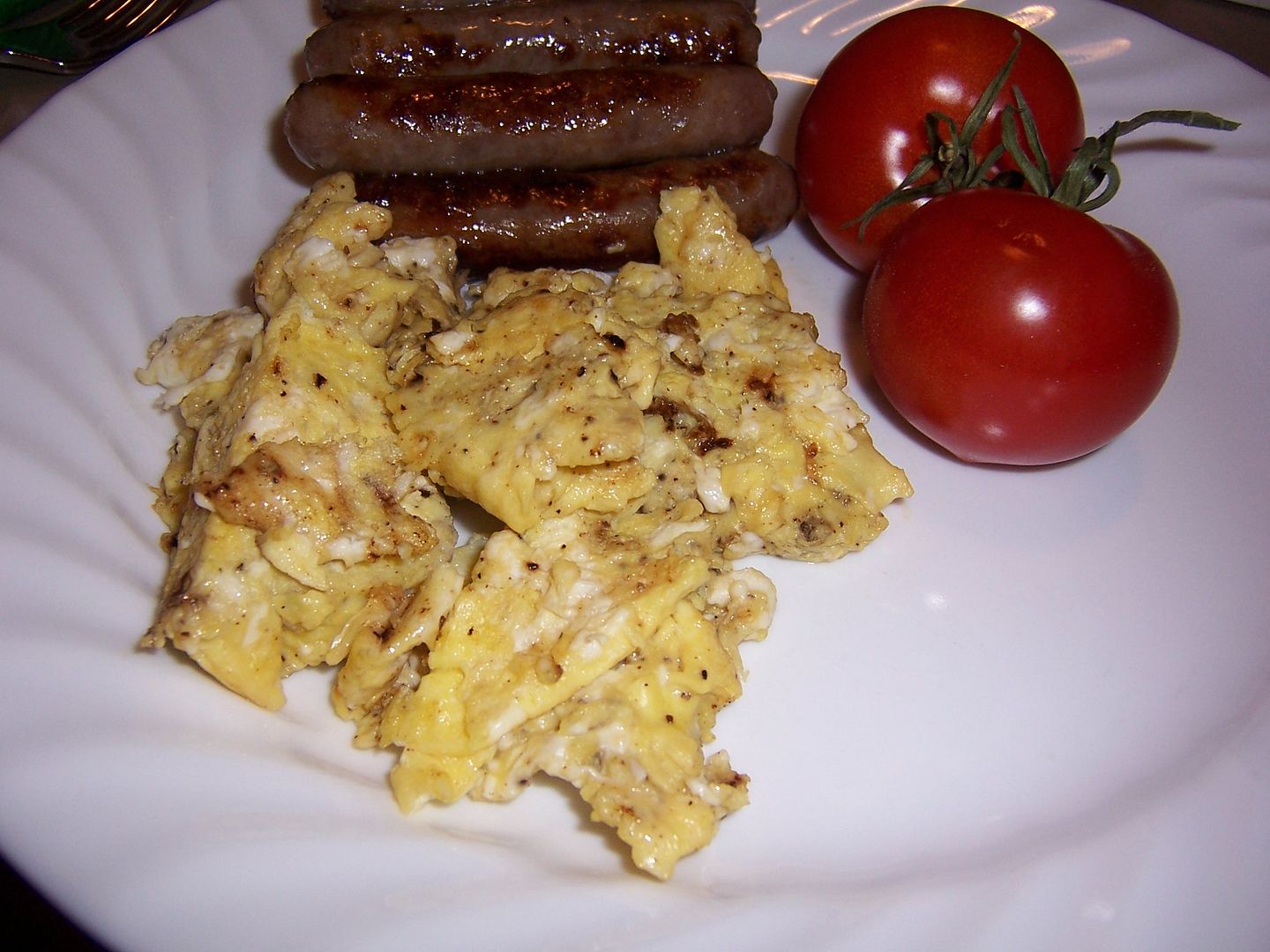 May 23, 2010 – 5:48 pmAn easy dinner tonight – some of our favorite sausages, scrambled eggs, and some fresh tomatoes.