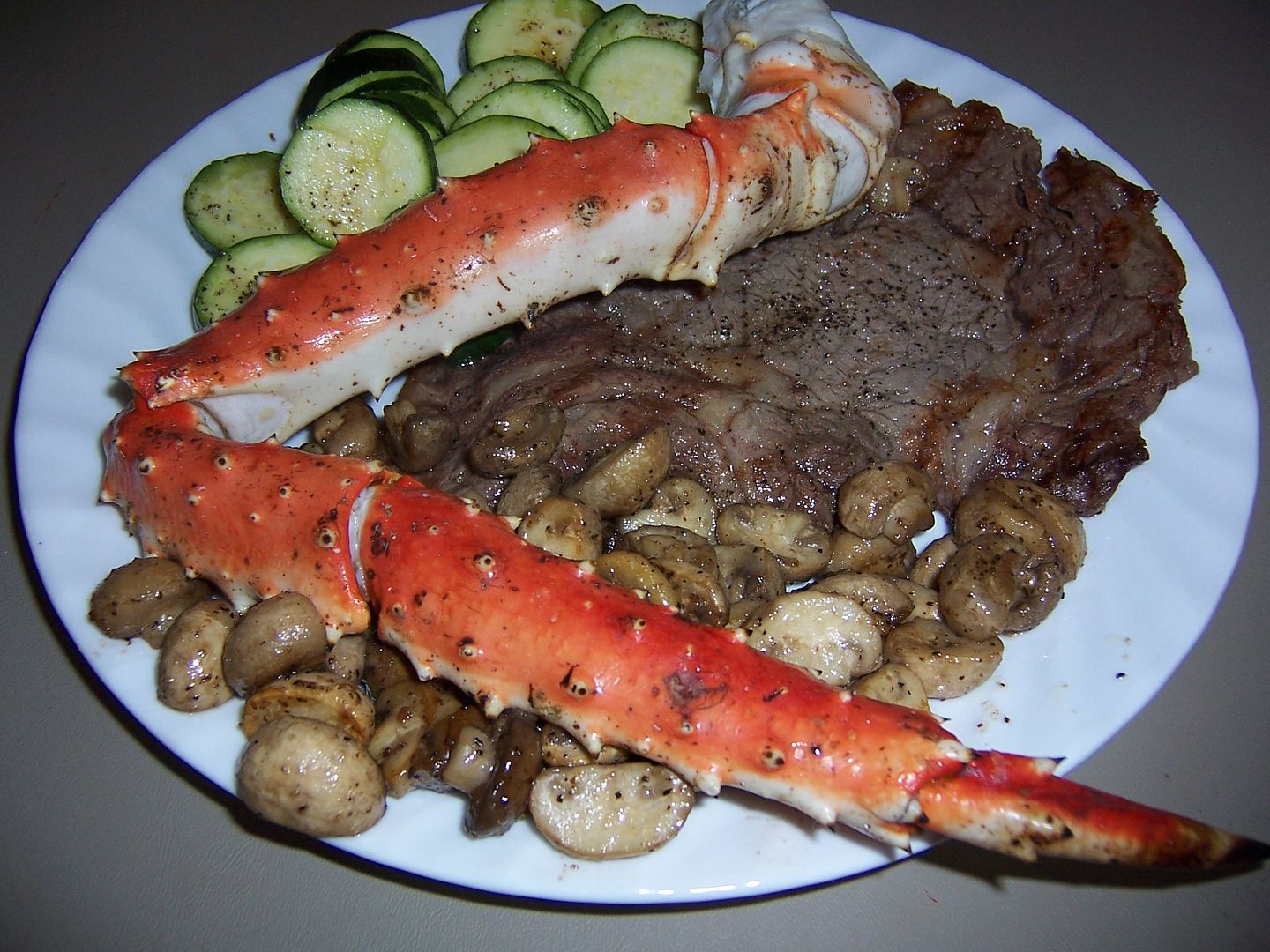 June 12, 2010 – 7:58 pmShaun had his last final of his first year of law school yesterday, so we had a celebratory dinner tonight – grilled thin cut ribeye steak, steamed king crab, sauteed mushrooms, and steamed zucchini. Yum!