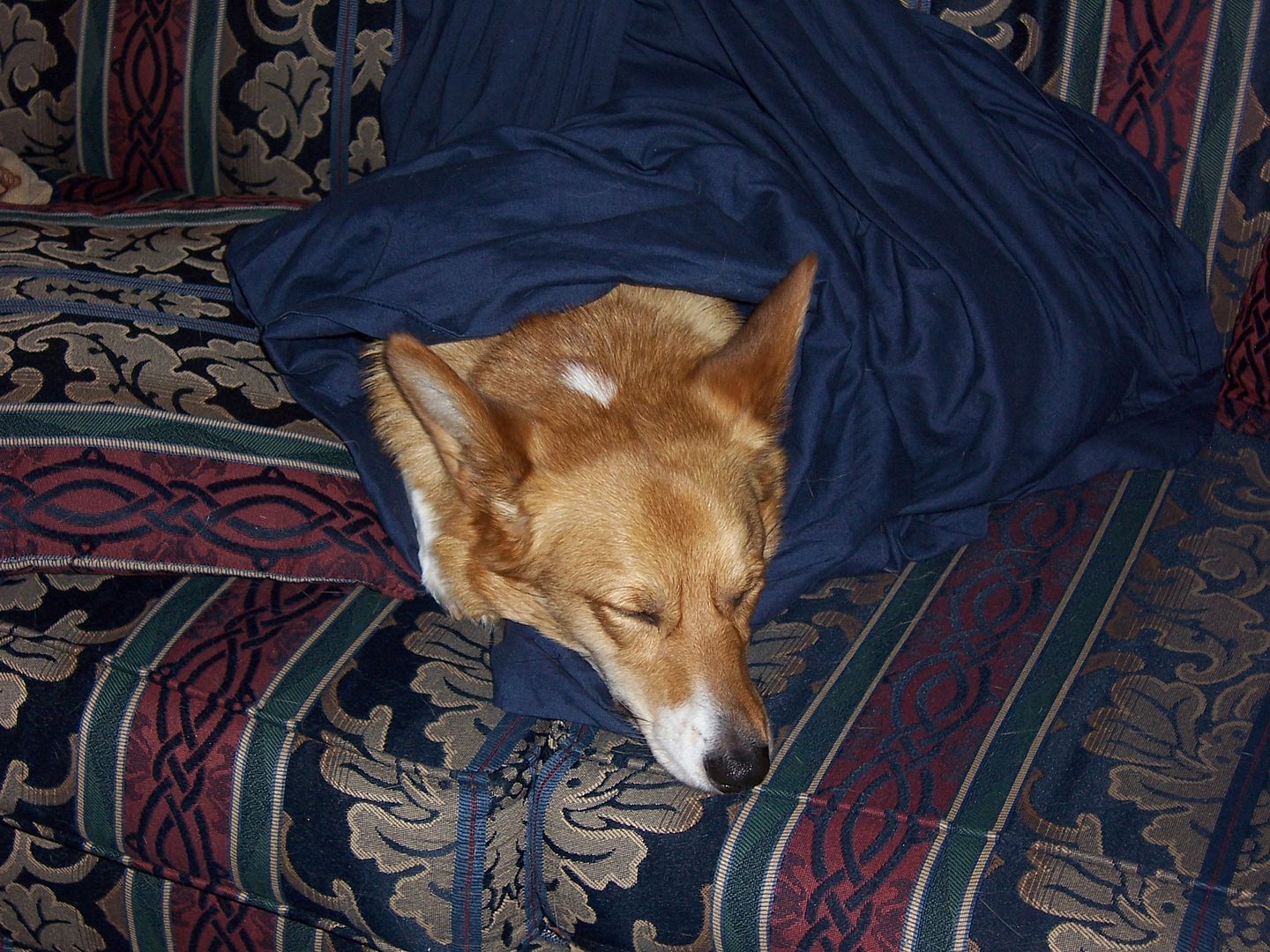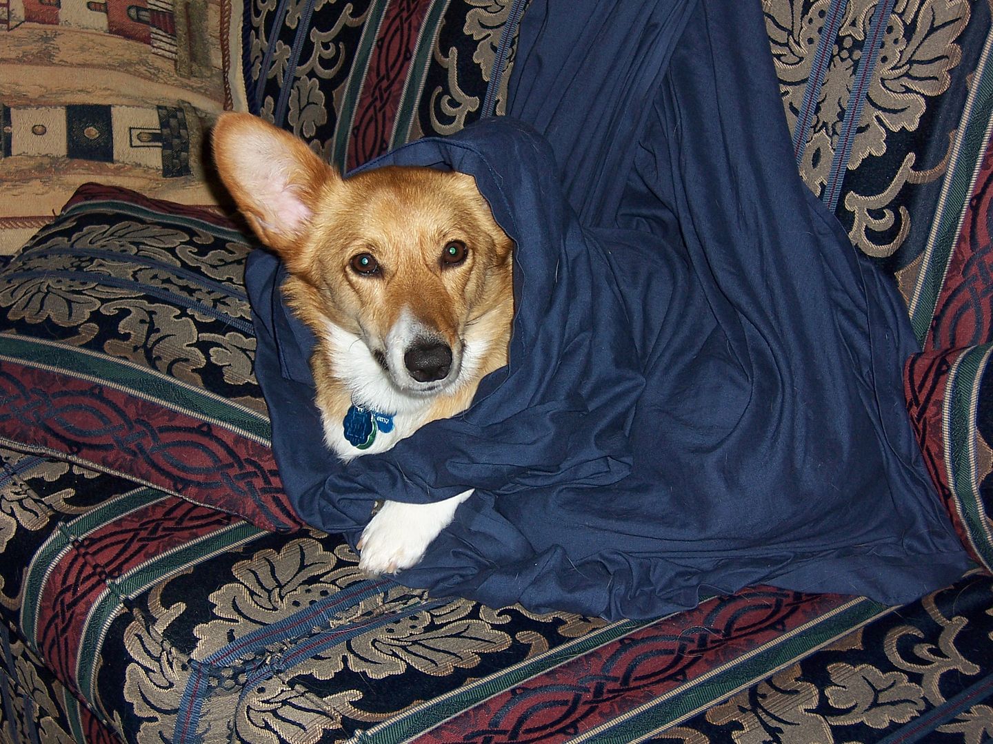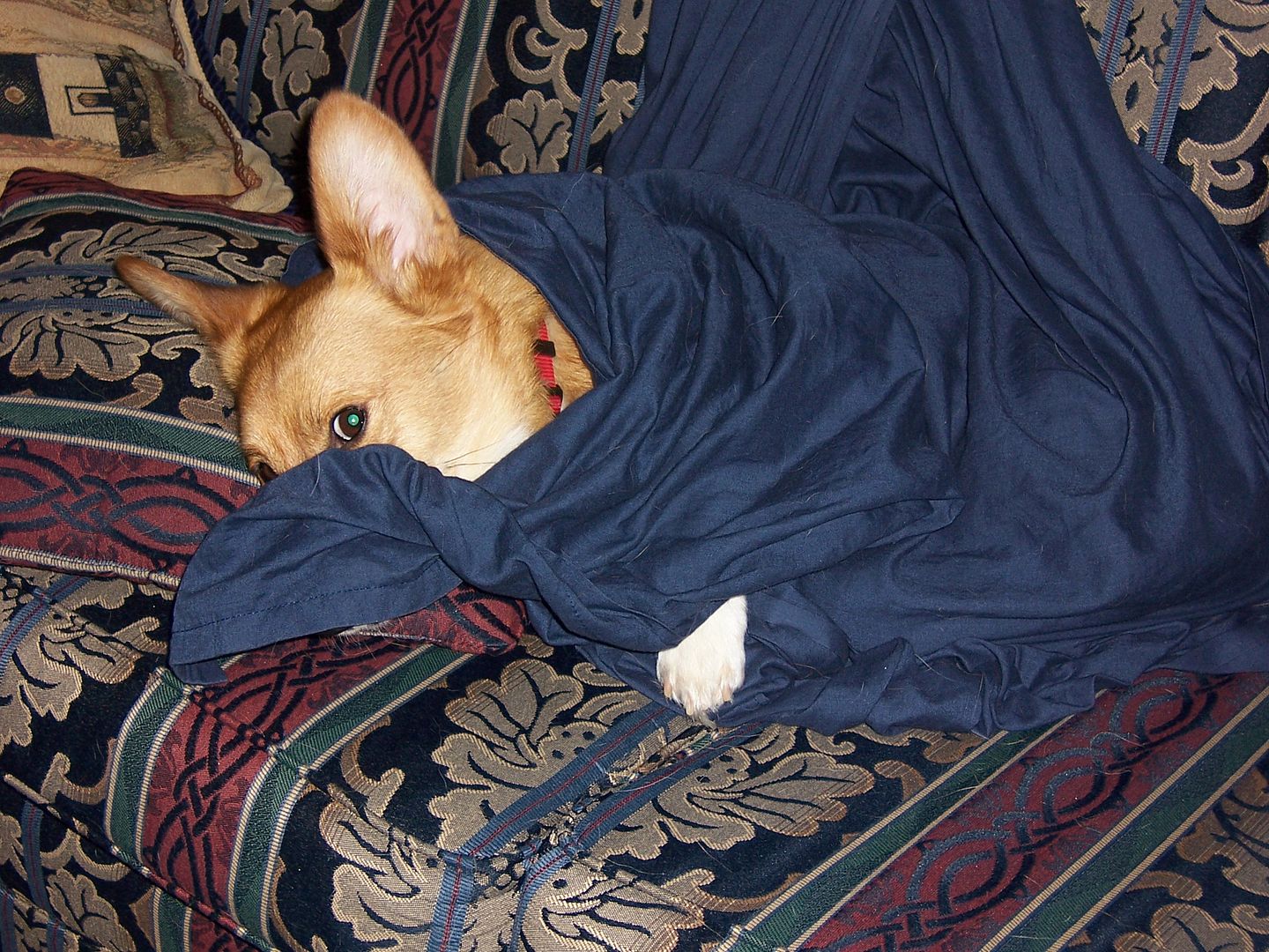 June 13, 2010 – 10:18 amEmma’s spent most of the morning wrapping herself up in the sheet we keep on the couch “to keep dog hair off it” (see how well this works? 😛 ). She actually let me get a couple pictures before hopping off the couch.