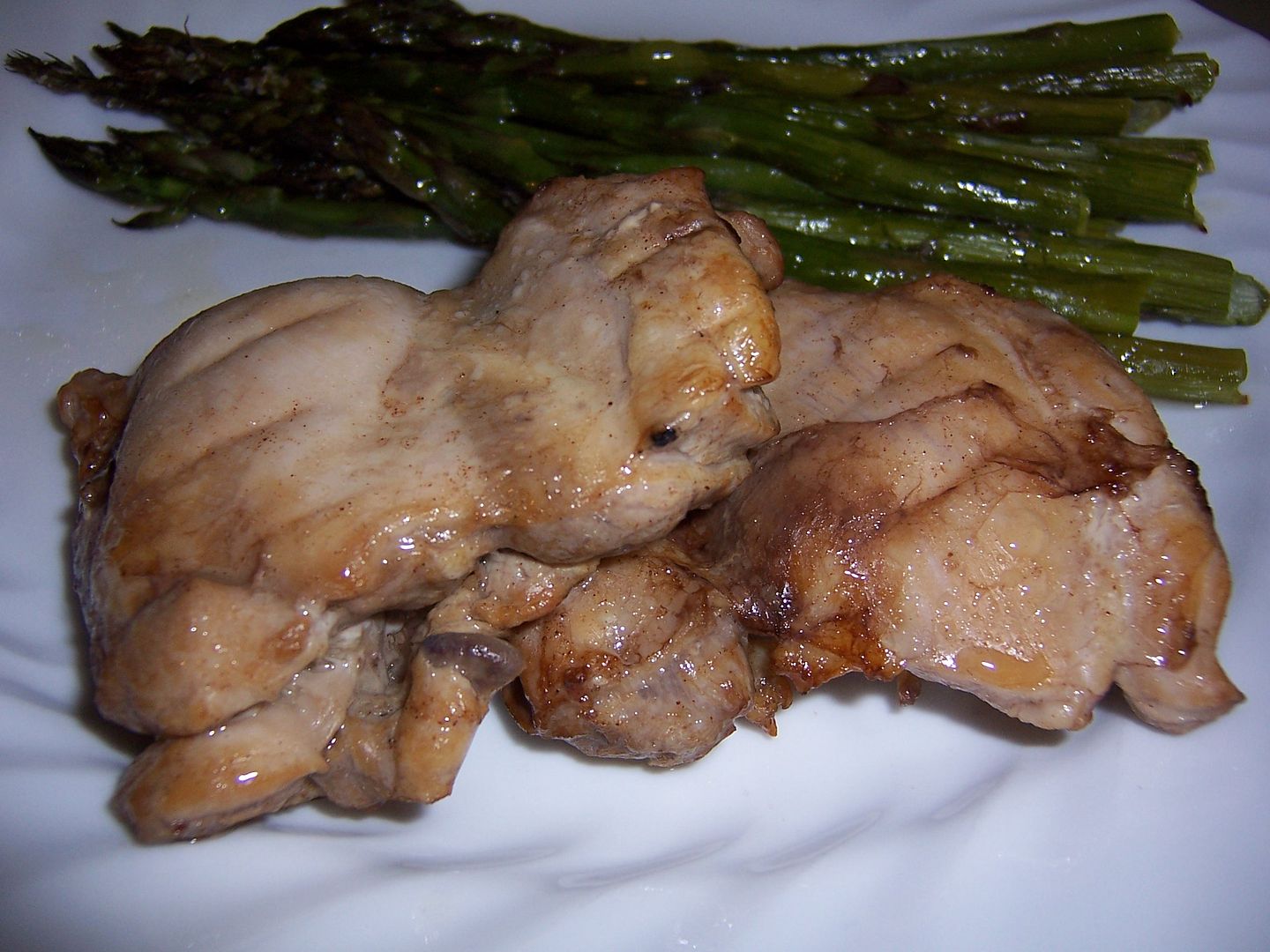 June 16, 2010 – 6:08 pmThis recipe is inspired by one from Rachel Ray. I omitted the star anise, and used skinless boneless chicken thighs instead of breasts. The flavor here was subtle, almost more of an aroma, but nice, and I’d definitely consider doing this again. I only marinated for 1 hour, and the flavor would be stronger with a longer time in the fridge. I served this with some roasted asparagus, drizzled with olive oil and sprinkled with kosher salt.