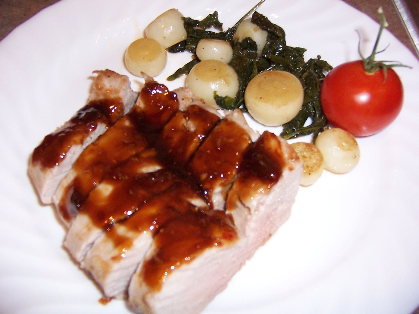 June 17, 2010 – 7:20 pmThis was a pretty tasty take on pork that was inspired by a similar recipe from Cooking Light. It was a bit heavy on the hoisin and light on the bourbon, so I think next time I’ll cut down the hoisin by half, double the bourbon, and use this as a marinade rather than a baste, and still boil it down as the pork cooks for a sauce. I’ve written it below as I made it tonight.