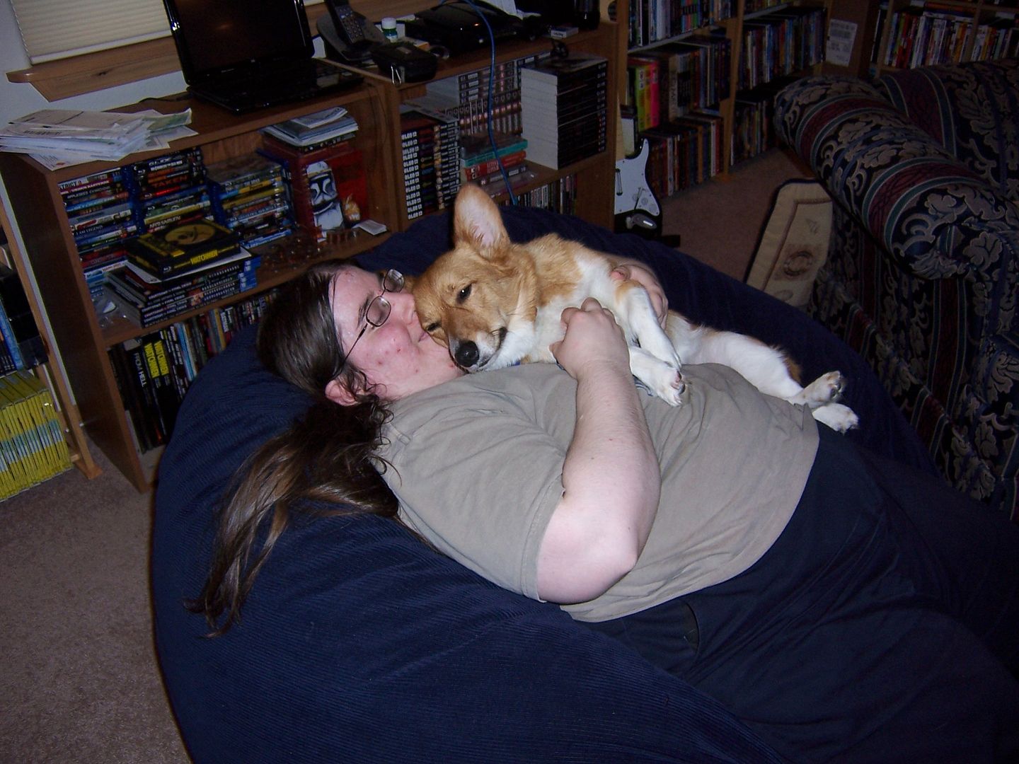 We cleaned off the big pillow chair of the accumulated junk, and Emma and I promptly enjoyed our nest. She and I both love the big comfy pillow 🙂
