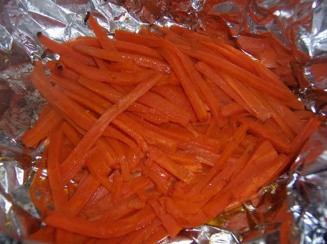 September 4, 2008 – 8:10 pmFoil packets are a great way to cook delicate things on the grill. Tonight’s salmon was cooked in foil, as were the asparagus and carrots accompanying the meal. I got thin asparagus spears and julienned the carrots so that they would cook in about the same time as the salmon. I just gave them a couple minutes head start while I sliced up the lemon and sealed up the salmon packet. This method really works well with just about any vegetable. Harder veggies like broccoli will take longer, as would bigger chunks of carrot. Just adjust as necessary to get the tenderness that you’d like.
