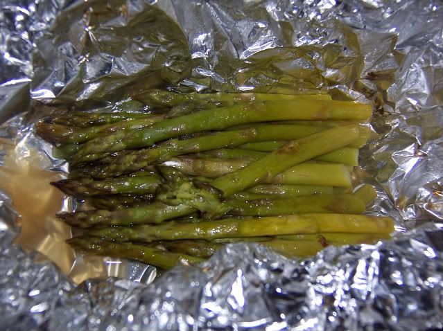 Place the asparagus spears in the center of a large piece of tin foil. Drizzle with olive oil and sprinkle with salt. Seal up the pouch by gathering the edges of the foil together and squishing to make a sort of a purse. You want it fairly well sealed so that the asparagus can steam, but don’t worry about getting it airtight. Grill over medium heat for 15 minutes or until the spears are tender.
