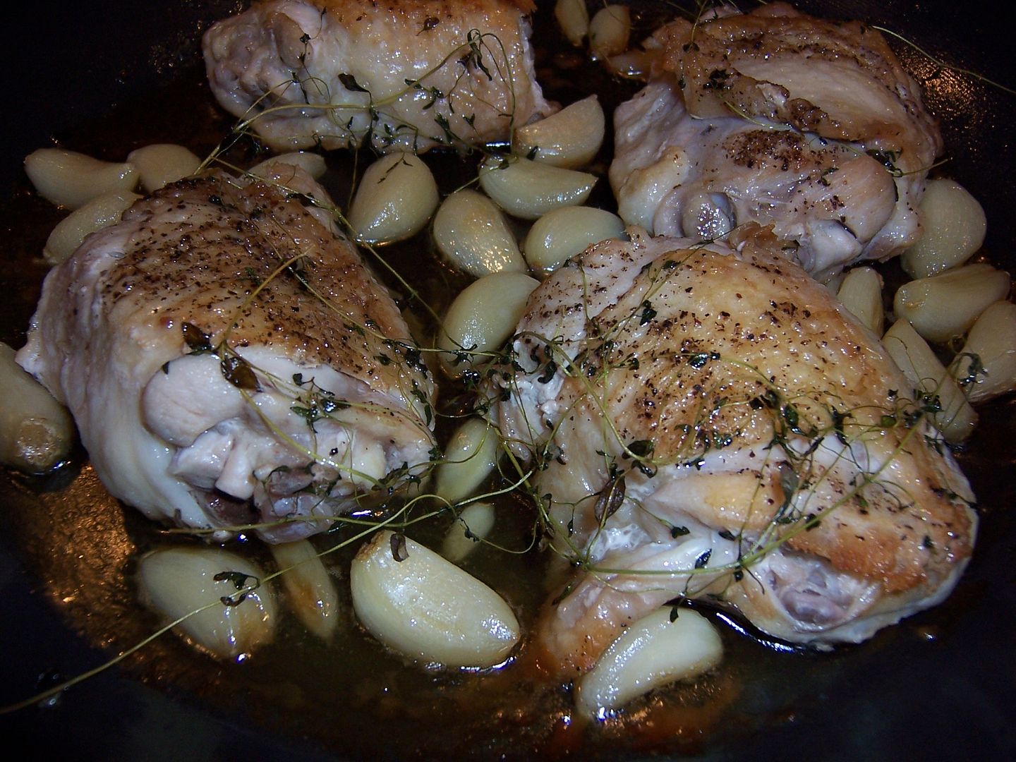 July 22, 2010 – 6:54 pmThis is a first take on the famous 40 garlic clove chicken recipes out there. I started with Alton Brown’s recipe, which was okay, but I was wishing for more garlic flavor in the chicken. Next time, I think I’ll add the step of marinating with a garlic paste for 24 hours, as with the lemon garlic chicken we had a little while ago. I might add some fresh oregano as well. I used only chicken thighs, rather than a whole cut up chicken, which made it easier to cook evenly, and as a bonus with the smaller pieces I only needed to bake them for about 30 minutes after browning. I also used only about 20 cloves of garlic since I had just 4 chicken thighs for the two of us. This was a decent launching point, and I look forward to further experiments.