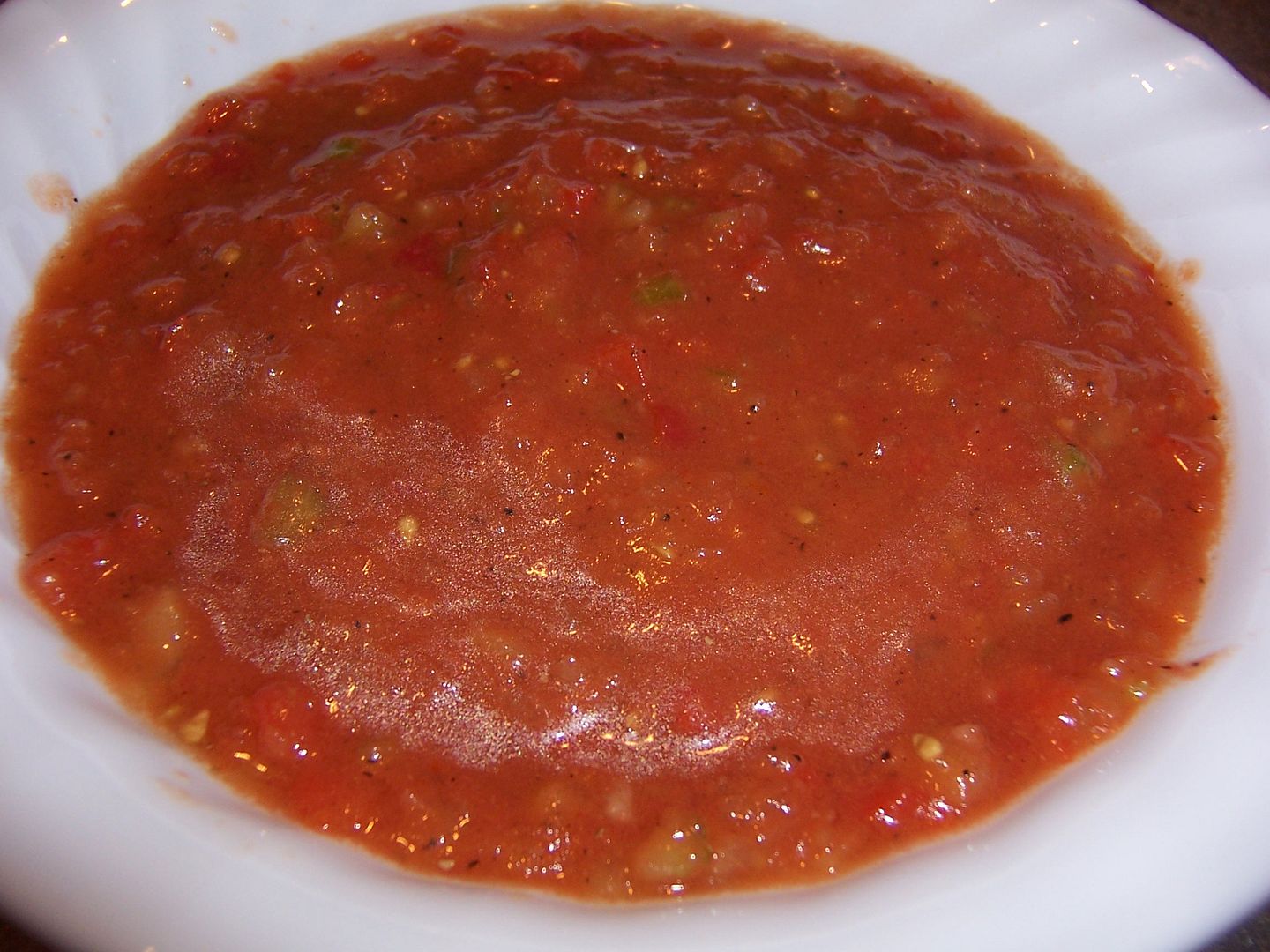 Combine all ingredients in a large blender or food processer and blend to desired consistency. Pour into a non-reactive bowl, cover, and refrigerate for at least 1 hour and up to overnight to let the flavors meld. Serve chilled.