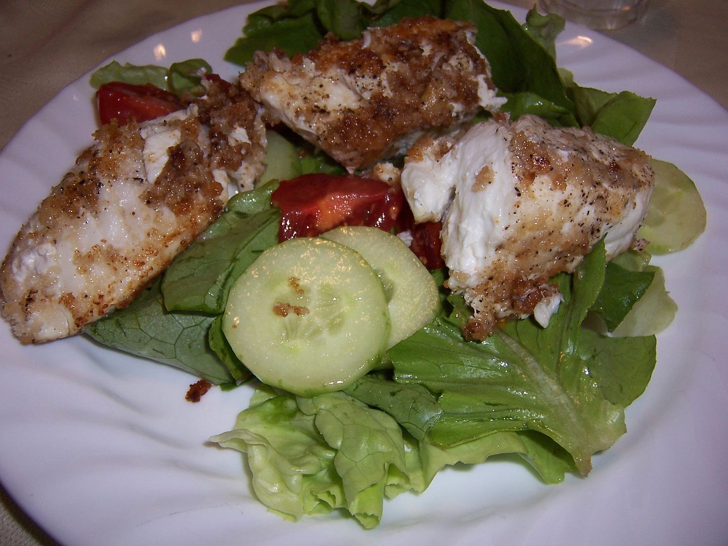September 9, 2010 – 7:47 pmThis was a very simple and delicious preparation for a lovely piece of fresh halibut. The skin was removed, the fish was seasoned lightly with pepper, then dusted with panko, and fried over medium heat in a little olive oil. Served over a tossed green salad, the light summer meal was complete.