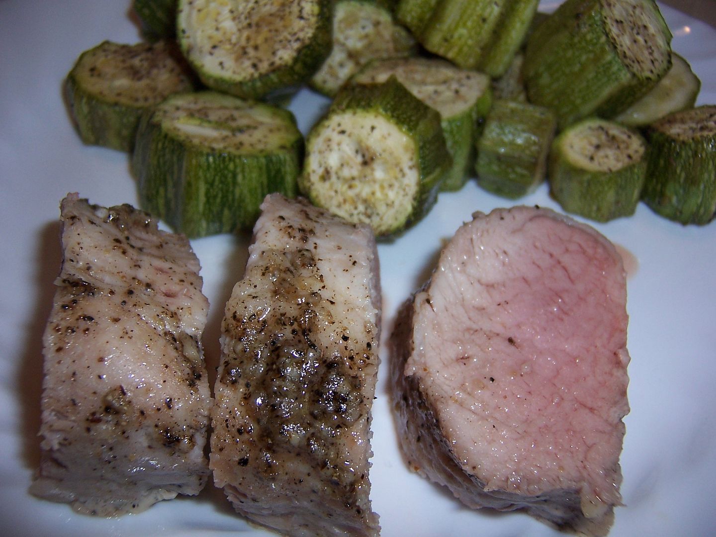 September 14, 2010 – 5:55 pmAnother simple and tasty dinner tonight. I preheated the oven to 425 degrees F, sliced up about 3 pounds of romanesco summer squash into 3/4 inch thick rounds, sprinkled them with kosher salt and black pepper and popped them in the oven. I then made a rub from about 2 tsp kosher salt, 1 tsp black pepper, 4 cloves of garlic, and 2 tsp olive oil, and rubbed that all over two pork tenderloins. I then threw those in the oven (the squash had about 10-15 minutes head start), and roasted until they reached an internal temperature of 145 degrees F, which is a little pink. If you like your pork well done, go up to 180 degrees F, and don’t give the squash a head start.