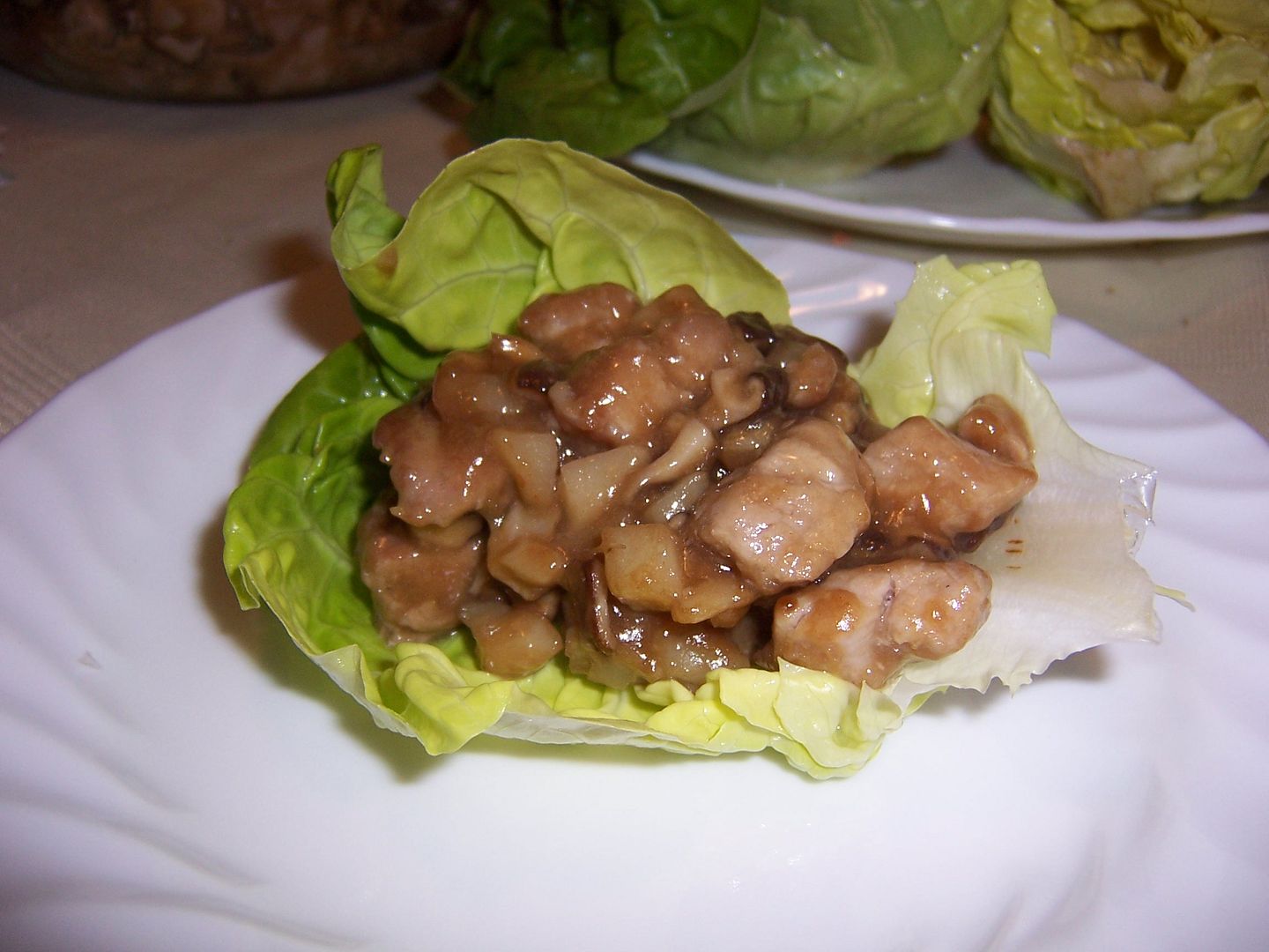 February 25, 2011 – 7:27 pmTonight, I made Chinese pork lettuce wraps, very similar to my Chinese chicken lettuce wraps, but using a pork tenderloin instead of the chicken thighs. We like the chicken version slightly better, but this was very good, and a great way to use up a pork tenderloin we had sitting around.