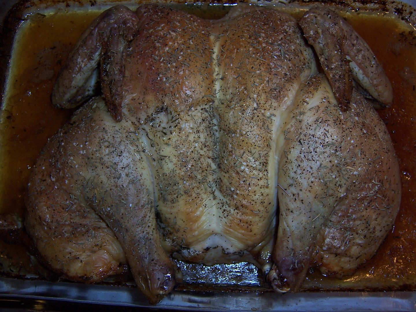 March 26, 2011 – 6:56 pmTonight I made a version of my beer roasted chicken. I spatchcocked my chicken (doesn’t that sound funny 😛 ), which means placed the chicken breast side down, cut out the backbone, being careful to leave the little tenderloin pieces on the thighs, flipped the chicken back over, and pressed down firmly to break the breast bone and flatten the bird. This increases the surface area exposed to the heat, which helps it to cook faster. I placed the bird breast and skin side up in a 9″ x 13″ baking dish, seasoned well with salt, pepper, and thyme, poured a beer into the bottom of the pan, and baked until the internal temperature in the breast reached 170 degrees F. I let it rest for 10 minutes to coast up to 180 degrees F and then carved and served with some steamed brussels sprouts.