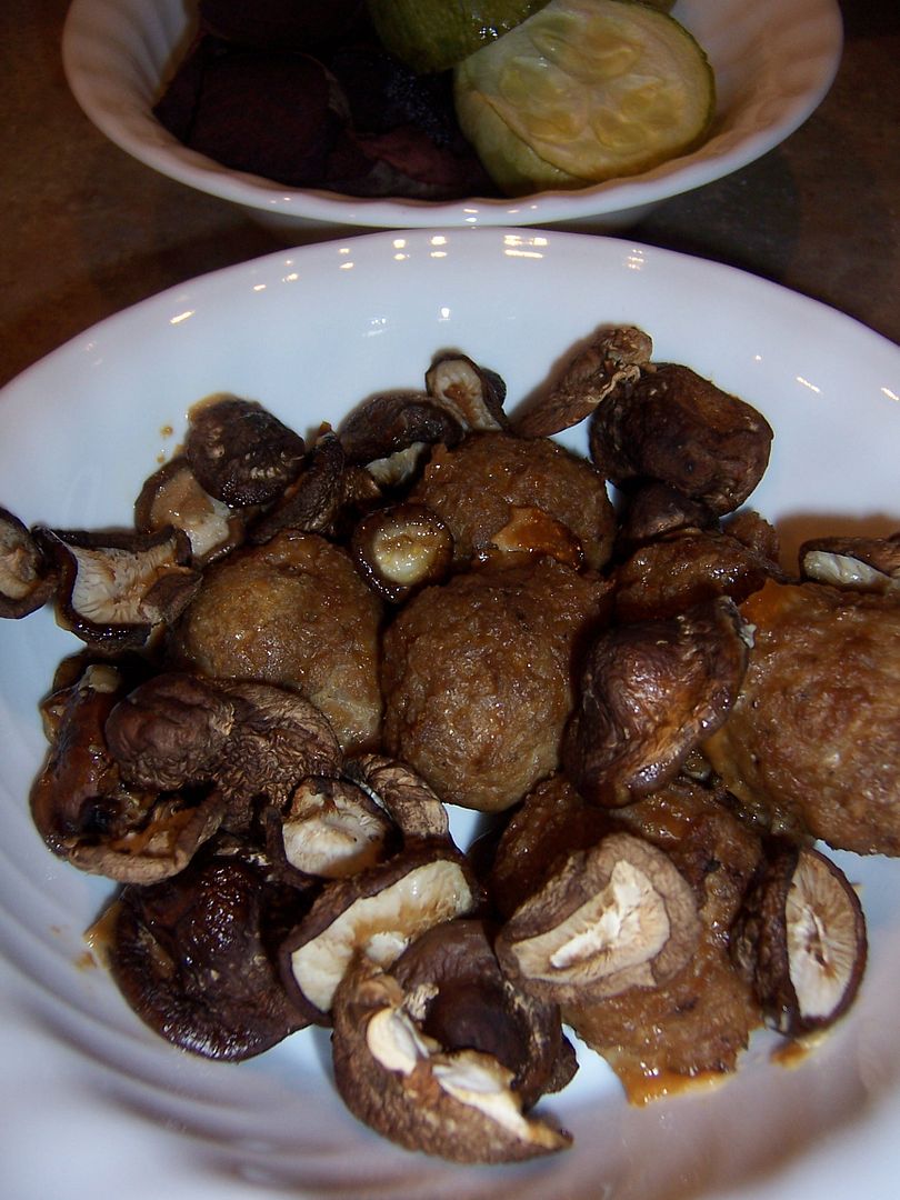 August 23, 2011 – 4:47 pmThis is another take on Asian turkey meatballs. The additions of hoisin, soy sauce, and ginger really made them even more flavorful and delicious. I roasted about a pound of shiitake mushrooms that I’d wiped clean and stemmed right alongside the meatballs and warmed up some roasted summer squash and beets from last night’s dinner to round out the veggies.