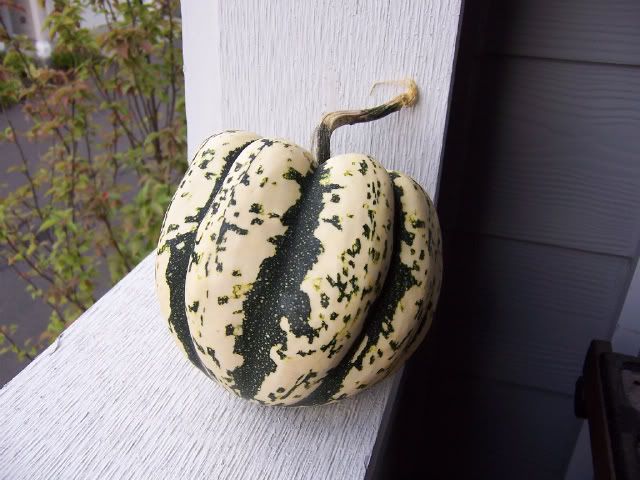 Yesterday marked the autumnal equinox – the first day of fall. It’s been noticeably cooler around here in the northwest, and much to my delight (and most everyone else’s annoyance) it rained quite a bit this weekend. I love the rain. I guess I’m in the right place 😉 It was the first time that it rained all month, actually. The summers here are gorgeous, and I’ll miss all of the fresh produce, but I love this time of year. The grocery stores just started stocking the first pumpkins and gourds of the season, and the winter squash bin is now overflowing after months of sparseness. The picture above is of a sweet dumpling squash that I’ll be roasting soon, probably tonight. I’m also looking forward to visiting Foster’s Farm and going through the corn maze before picking out some pumpkins and getting some of their great pumpkin butter. Yum!