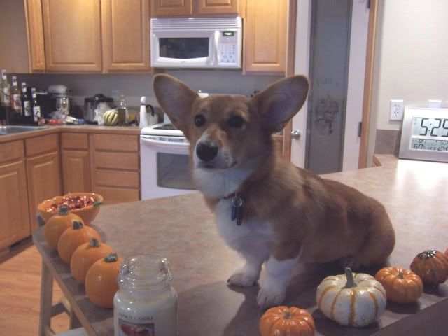 September 25, 2008 – 7:25 amI cleaned off my big kitchen counter yesterday and decorated for fall. Shaun decided that Emma needed to get in on the action and promptly placed her on my nice clean counter 😛 She was very confused, but I did get some good pictures before putting her back on the floor and rescrubbing the counter to remove corgi footprints 😉 I apologize for the dark picture. It gets dim early these days!