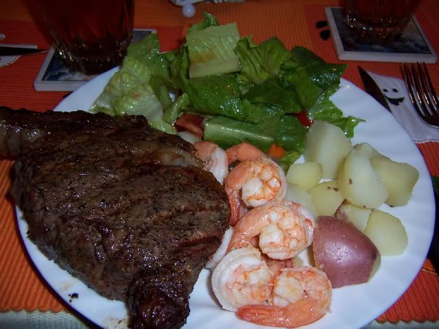 For dinner, we made some sautéed shrimp (just a bit of olive oil, 3 cloves of garlic, a few good sloshes of Chipotle Tabasco, and a couple pound bag of shrimp from Costco, all dumped in a a big pan and cooked until the shrimp were nice and pink), grilled steaks, boiled new red potatoes, and tossed green salad. It was a great dinner made even better by getting to enjoy it with my parents. Have a fun and relaxing vacation guys!