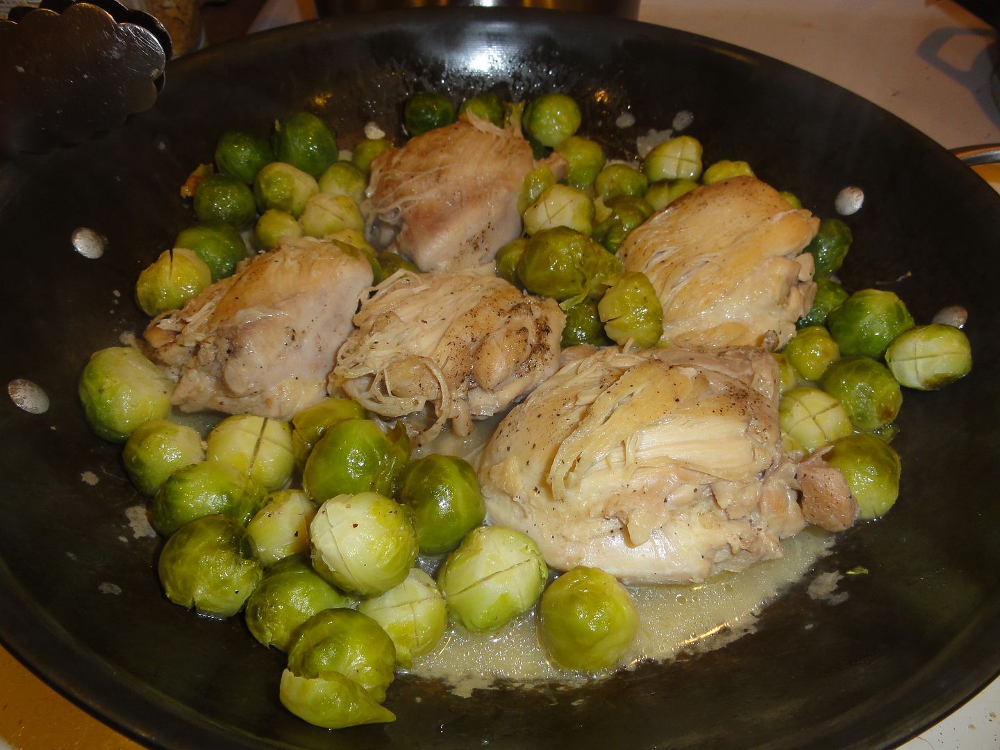 January 3, 2012 – 6:37 pmThis is a fast and easy one pan dinner. Skinless boneless chicken thighs and small brussels sprouts are seasoned with salt and pepper, browned in olive oil, then braised in a somewhat dry white wine. I used a moscato (Beringer), but a chardonnay would work well here too.