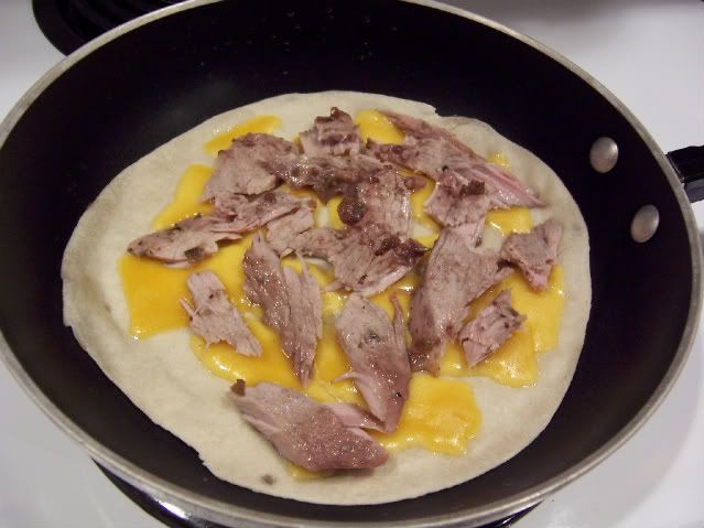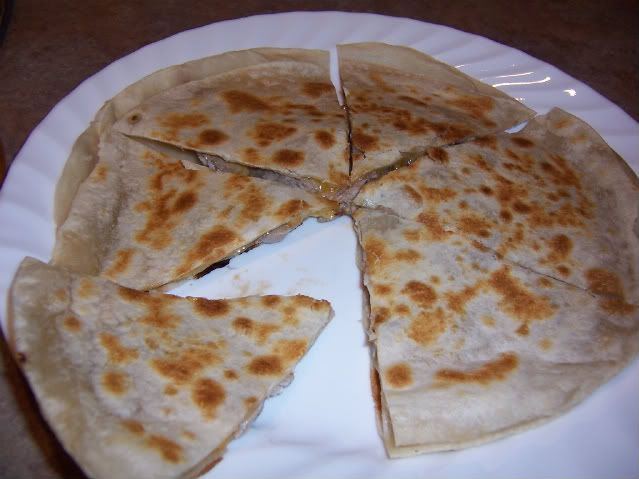 October 5, 2008 – 7:45 pmAfter a big lunch of pizza while watching football after seeing my folks off to the airport, neither one of us were feeling very hungry when dinner time rolled around. Shaun just had some snacks, and I constructed myself a quesadilla. You can really put just about anything that you want in these. I just used up some of the leftover pork tenderloin along with some Tillamook cheddar and a couple of the wonderful uncooked Tortillaland tortillas (available at Costco). If you’re using cooked tortillas, you won’t need quite as long in the skillet.