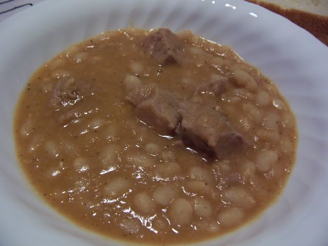 December 20, 2008 – 7:44 pmThis is a take on navy bean soup that uses up some of our leftover chile rubbed pork tenderloin. I made a quick french bread loaf with my little “Just For Dinner” bread maker to go with it. It’s great for just the two of us. The hearty soup really hit the spot on yet another day of cold and snow here in the Pacific Northwest. Snowflakes are gently falling again, and it looks like we’ll have a white Christmas!