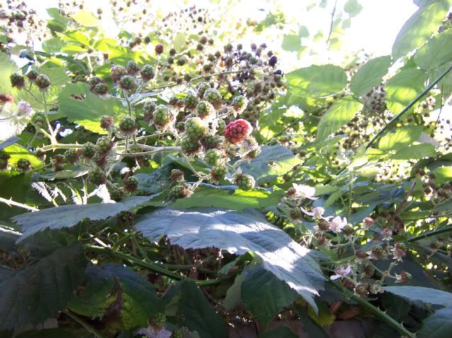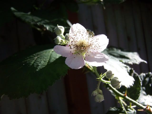 August 4, 2008 – 6:43 pmThere is a blackberry bramble on the other side of the fence behind our house. Many tendrils poke over, much to my delight. I’ve been happily watching it grow all summer. Now, there are many blossoms and baby berries. I’m looking forward to picking a few in several weeks!