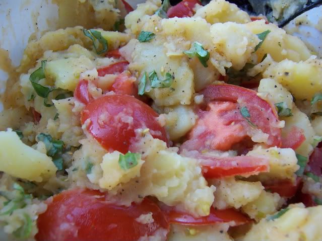 August 11, 2008 – 8:30 pmI got this great recipe from It’s All Gouda. This is a Southern Italian take on potato salad – no mayo or mustard involved, just potatoes, tomatoes, fresh herbs, and a simple vinaigrette. I omitted the onion as raw onions give me migraines, so my version of the recipe is below. I very much enjoyed this fresh and light salad.