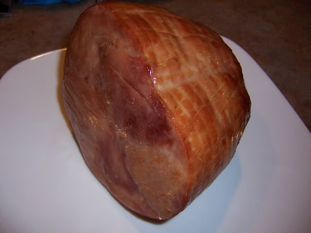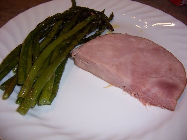 February 5, 2009 – 7:56 pmTonight’s dinner was a nice little locally produced honey ham (from Hempler’s Meats) baked in the oven and served with some roasted asparagus. I love the big bone-in hams, especially made with a variation of Nigella Lawson’s recipe for Ham in Cola, but with just the two of us, that makes rather too much.