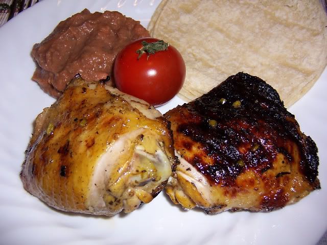 March 31, 2009 – 5:56 pmThis is another attempt at recreating the wonderfully flavorful chicken at El Pollo Loco, one of the few things I miss about Southern California (most of which seem to be food related 😛 ). I found this recipe here via Google. The source is listed as the Orange County Register, but I could not verify that. I increased the garlic, black pepper, and the minced chile for our version, and used chicken thighs rather than a whole cut up chicken. I also changed the grilling method a bit. I found that medium heat was too high for my grill.