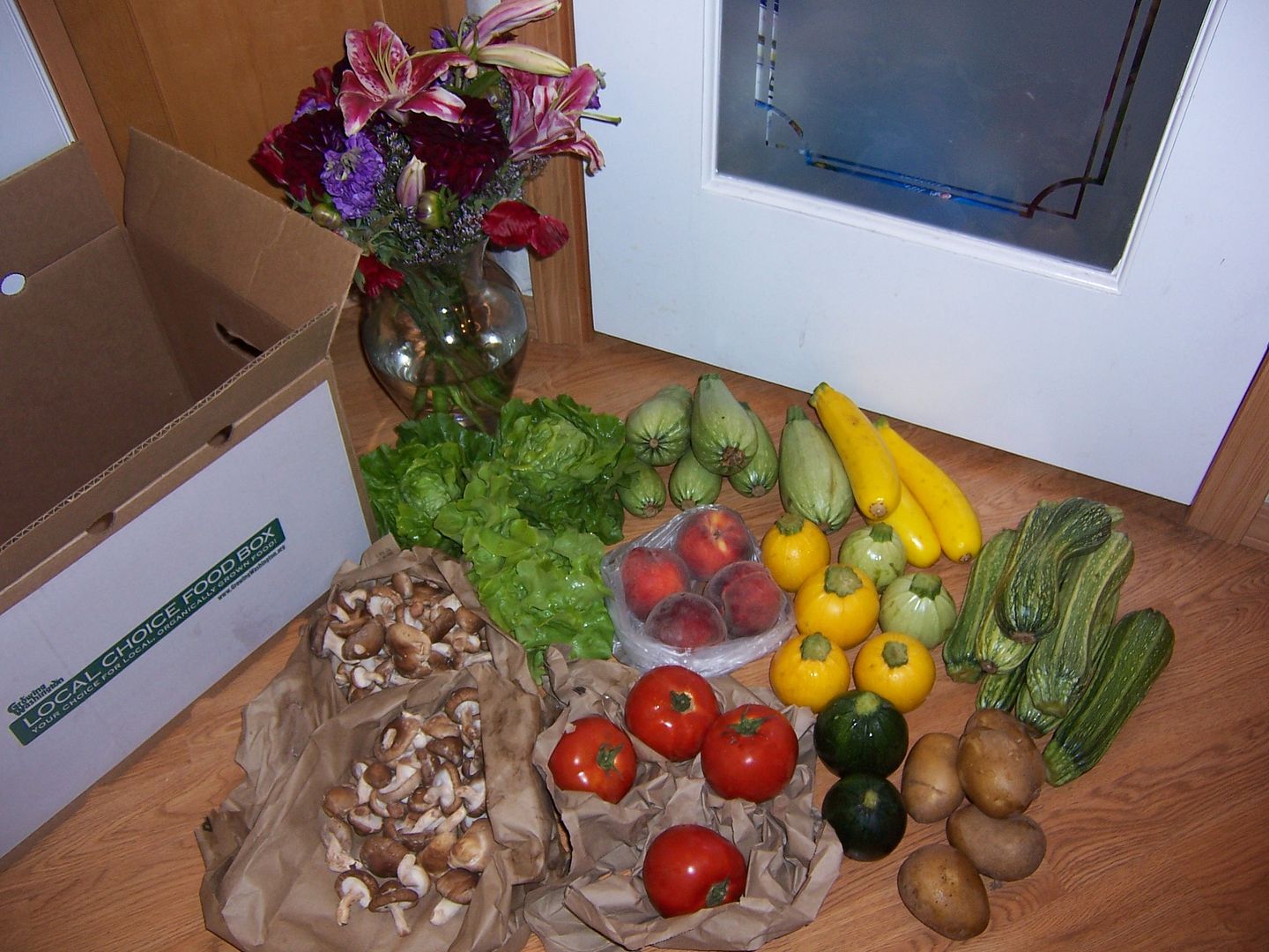August 18, 2011 – 5:25 pmAnother great box this week from Growing Washington. More summer squash bounty, some gorgeous tomatoes and mushrooms, beautiful baby lettuce, yellow potatoes, and juicy peaches 🙂